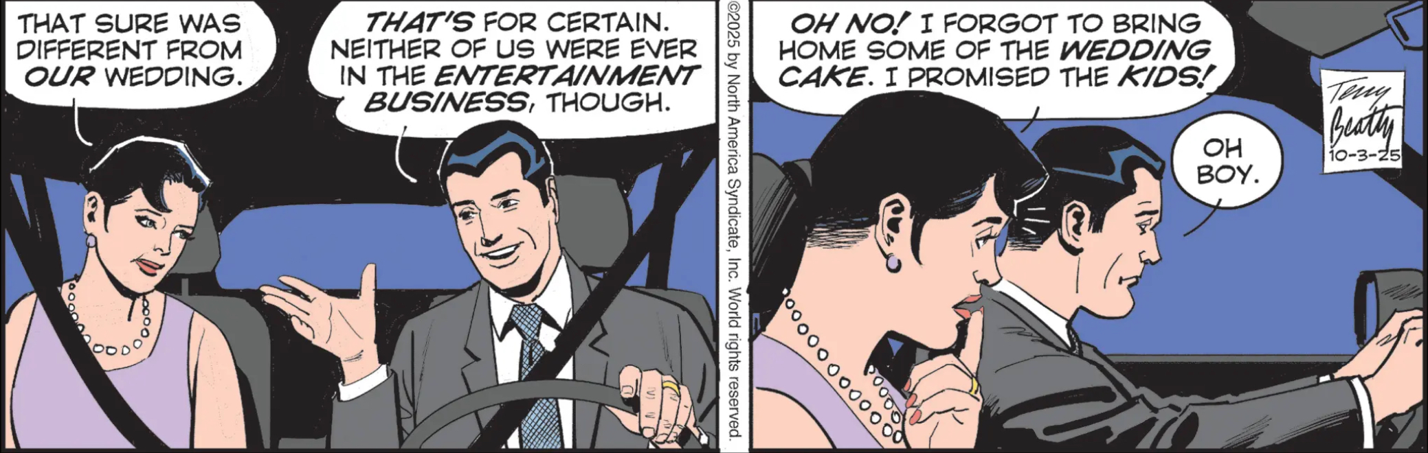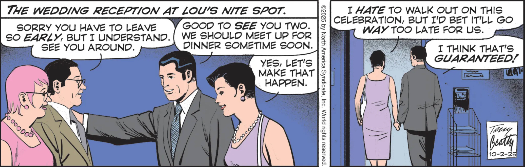 I was trying to imagine what hedonistic and shocking activity the assembled Ameripolitans would be engaged in when Rex and June turn around and sneak back to the wedding as it gets later and wilder to see if they can make off with enough wedding cake to satiate their greedy children. Honestly doesn’t seem like an orgy crowd, but maybe … cocaine? Hard rocking country musicians, many of whom are older guys who probably came of age in the ’80s … they’ve moved on from booze to coke at this point, right? Never mind what I said up above about the Wizard of Id, I’m a blogger on the seedy internet and I’m allowed to make these jokes.