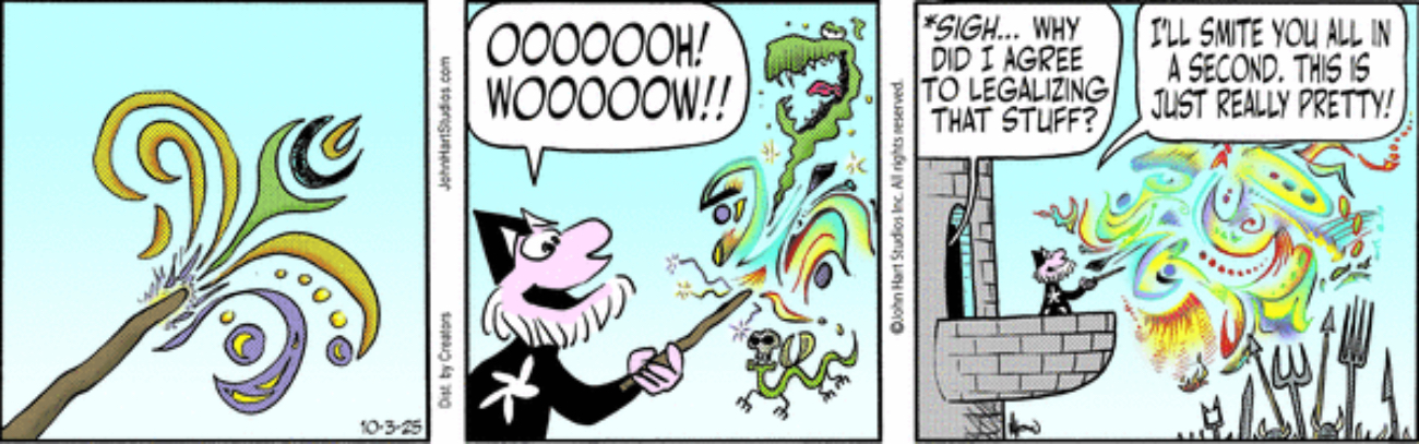 It absolutely makes sense that people hear “New York” and think of New York City — the city is a world cultural capital, is the economic engine of the state and indeed much of the country, and a majority of the state population lives either in the city itself or its immediately adjacent suburbs. Still, when you grow up (like I did) in a very different kind of city that happens to be at the complete opposite end of the state, you get a little whiplash when you hear about things happening in “New York.” For instance, when New York legalized marijuana for recreational use, I was already living in Los Angeles, another megacity that was ahead of the curve on that one, so the idea of people in Brooklyn or Manhattan being able to buy weed at some high-end hipster dispensary absolutely made sense. But legalization was a state decision, not a city one, and going home to the Buffalo area and seeing janky stores in suburban strip malls near where my parents live named things like “The Devil’s Lettuce” was significantly weirder. Anyway, that’s kind of how I feel about newspaper comics doing weed legalization jokes. This topic belongs in alternative comics on the seedy internet! Not in the newspaper in front of God and everybody!