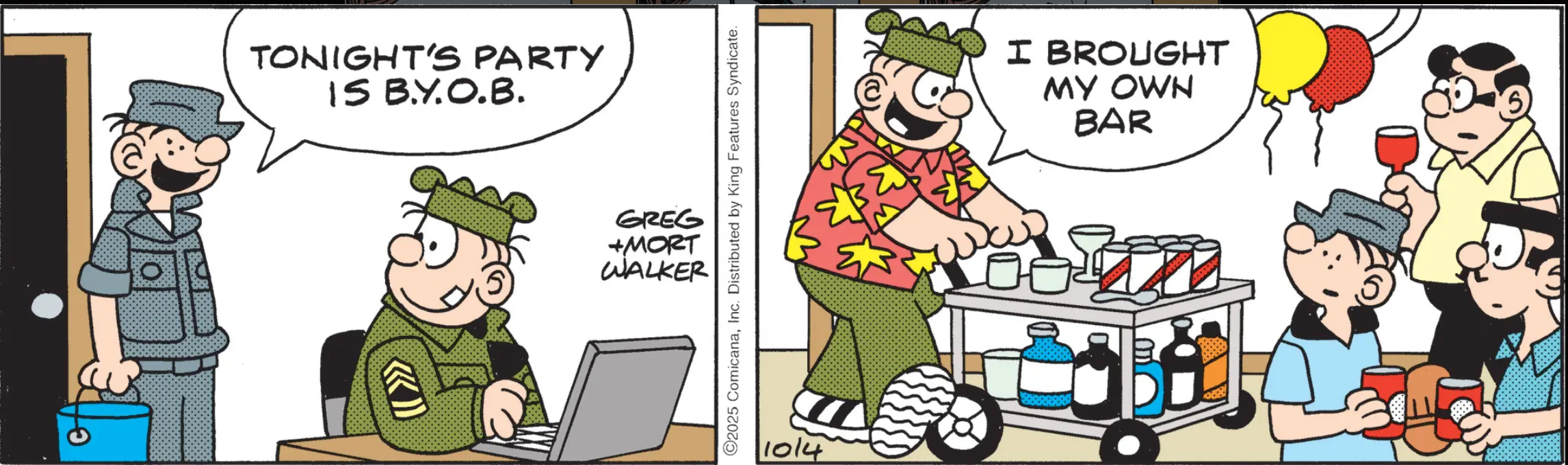 Remember, folks, Beetle Bailey’s Sgt. Snorkel isn’t just a violent man with an eating problem; he also has a drinking problem! They don’t dwell on that so much these days but it’s still canon.